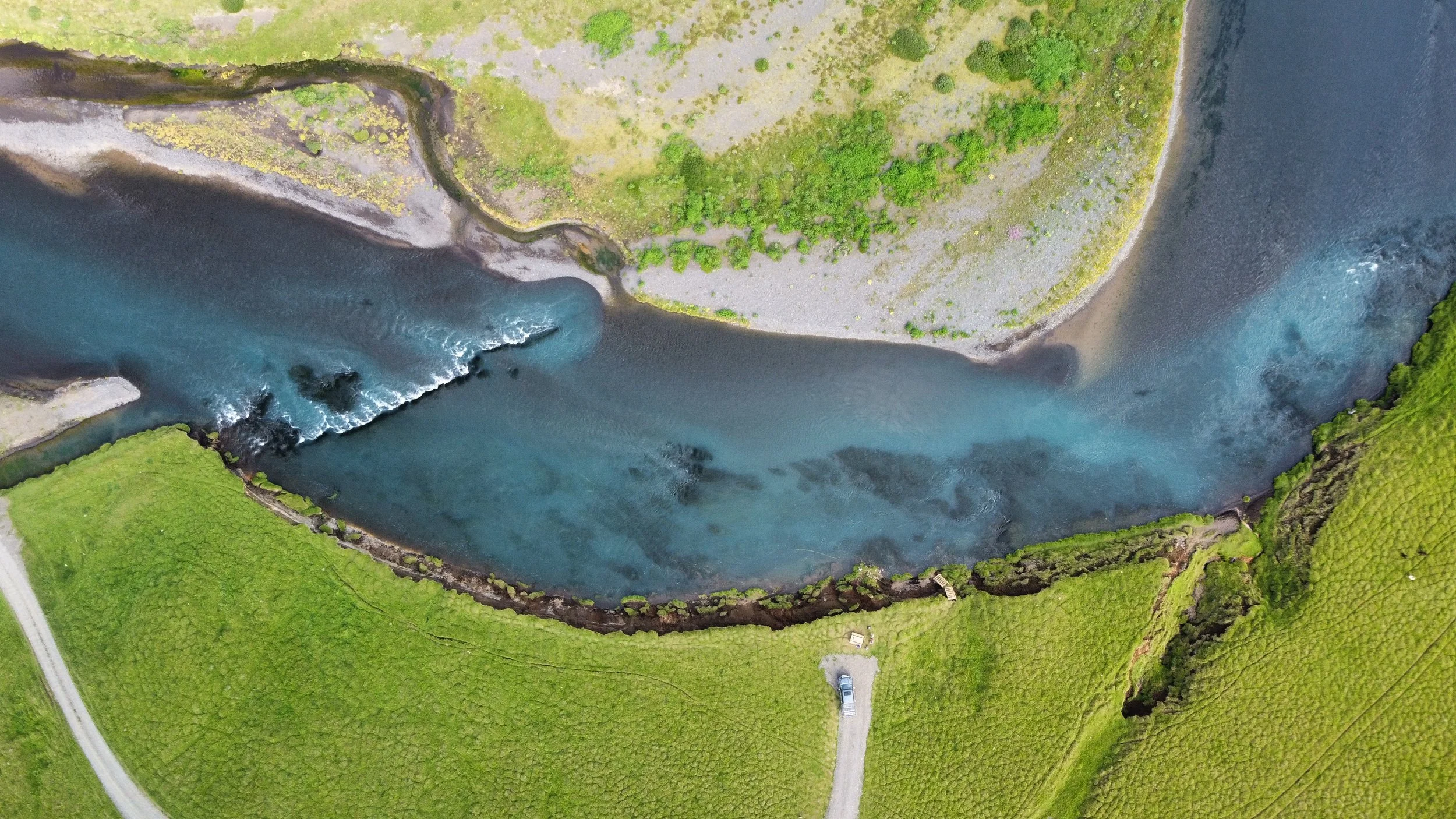 The river is fished over approximately 22 km from an impassable waterfall at the head of Beat 9 down to the junction with the Thvera on Beat 1. Along this length of river, the pools variously sit under high bluffs, curve from cut bank to cut bank or gently ease up to purple lupin lined banks, each beat offering a variety of characteristics and at the same time maintaining enviably attractive fly water.
