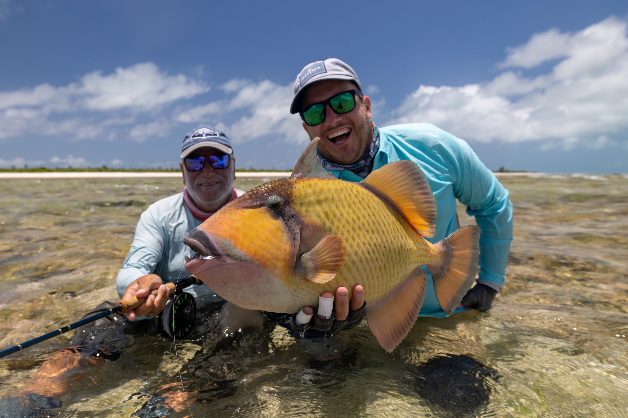 Roger had a dream day, landing his first GT on fly, followed by another only hours later, before completing the first flats slam of the season — a GT, triggerfish, and bonefish all in one session. On another boat, Anthony and Fred found themselves in the thick of GT action with six fish landed, including Anthony’s 114 cm beast, the first metre-plus GT of the season. The energy on the atoll only intensified from there, with Seth landed a 100 cm GT, his rod snapping mid-fight as he wrestled the powerhouse away from the coral heads.