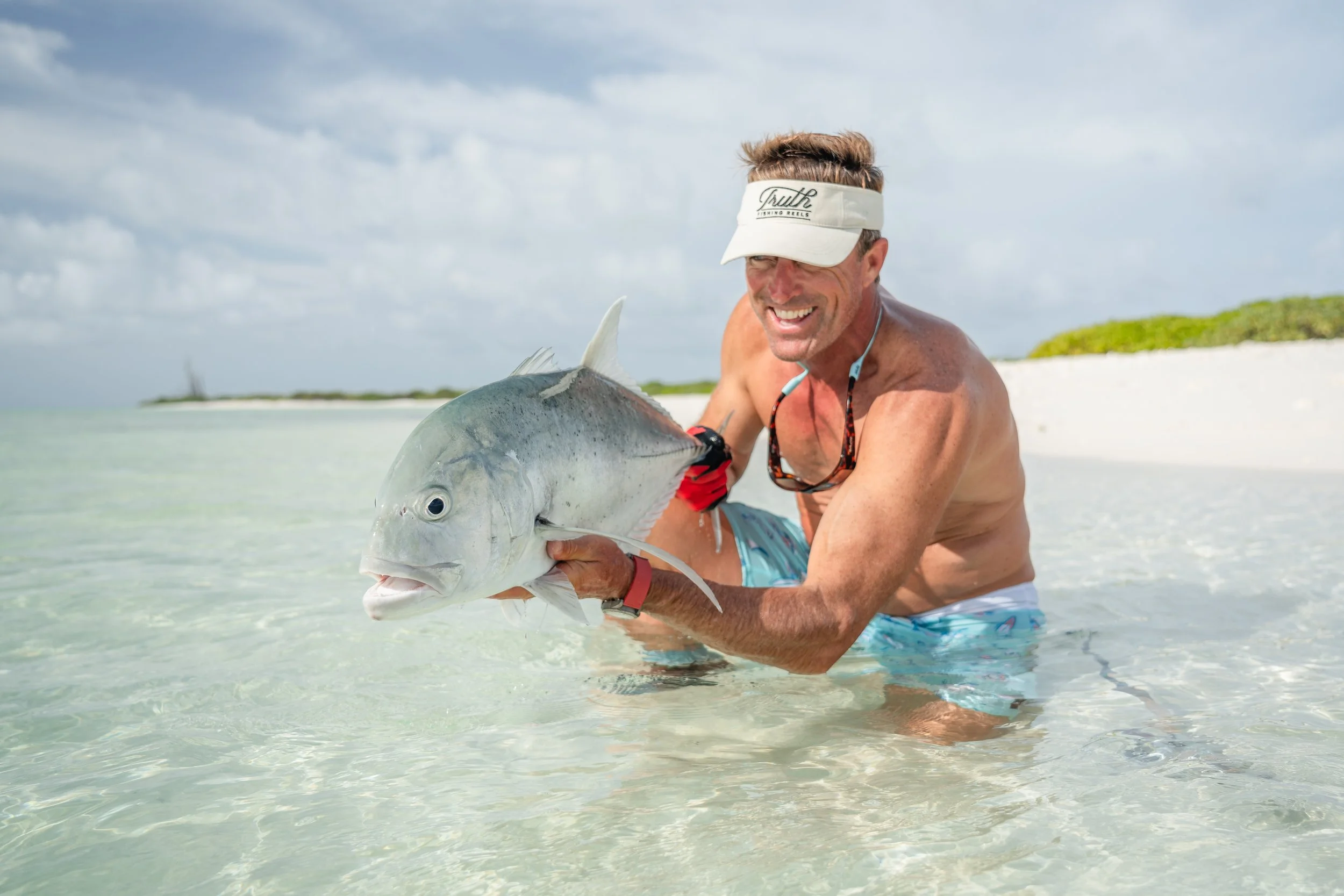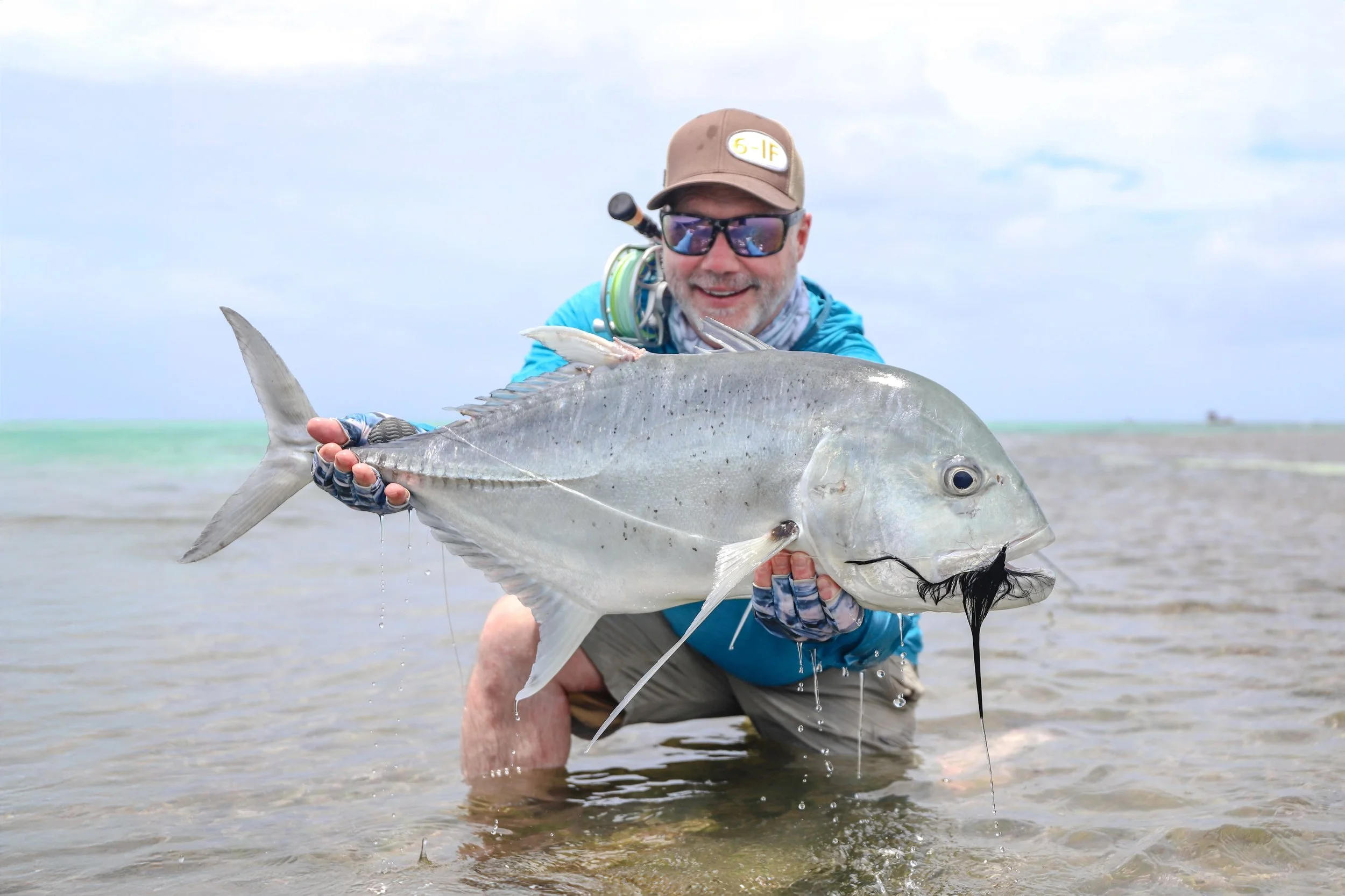 On guide Chad’s boat a monumental day ensued as one of the anglers would go on to catch the fish of a lifetime. Wes and Lake set out on a mission to try catch a large GT. Wes opened the account for the day with a small GT to get the ball rolling. After spotting a nice fish on a coral head, Lake laid out a beautiful cast to the fish and after a few strips the fish ate the fly aggressively and turned, immediately sending Lake’s fly line shooting up over his reel and rod butt. Using a Seigler reel with a lever for quick release on the drag, Lake managed to loosen up and sort out the line quickly. After some coral dodging and team effort the fish was landed and measured in at 99 cm, just barely missing the ever sought after trophy metre plus mark. Still a beast of a fish nevertheless and one to remember for Lake.