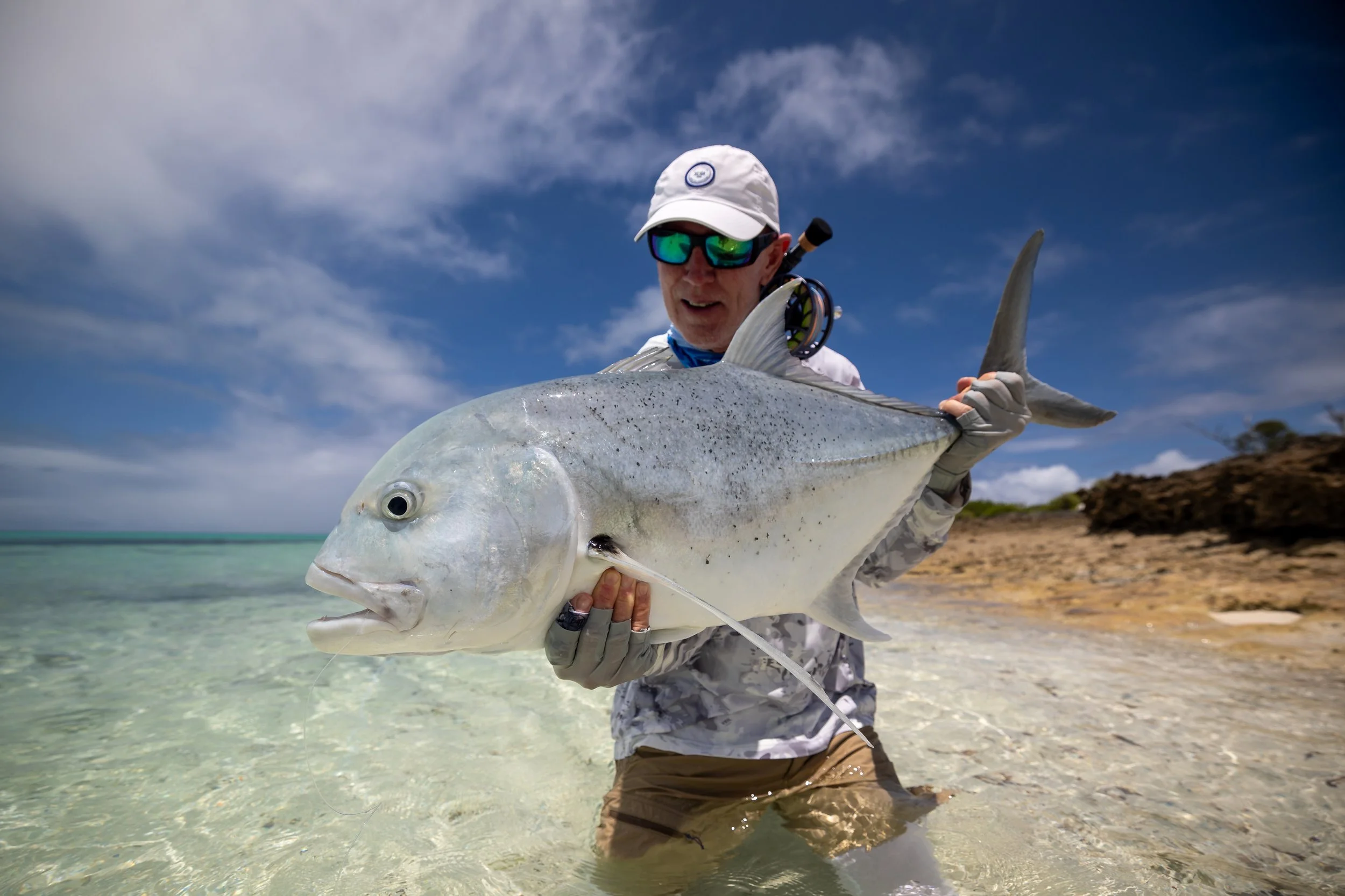 Bill and Bryan both landed their first-ever GTs—Bill’s coming on foot as a large nurse shark cruised the flat with several GTs shadowing behind, creating perfect competition for the fly. Hendrik followed with a beautifully conditioned 92 cm silver GT drifting through a channel. Greg, Andrew, Lance, and Ralph also added to the GT tally. One of the period’s standout moments belonged to Brett: while drifting over a white-sand depression, three large GTs materialized. His cast lit them up immediately, and although all three charged, the biggest surged ahead, crushed the fly, and tore across the turtle grass. Against all odds, it avoided nearly every coral head, allowing Brett to land an impressive 103 cm fish.
